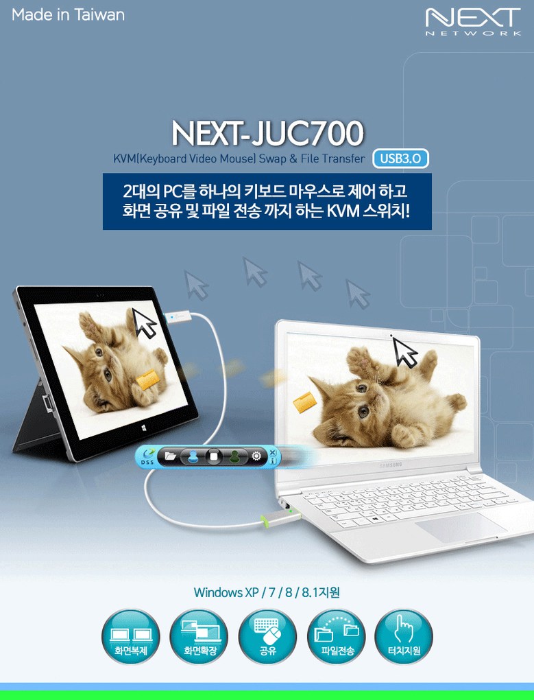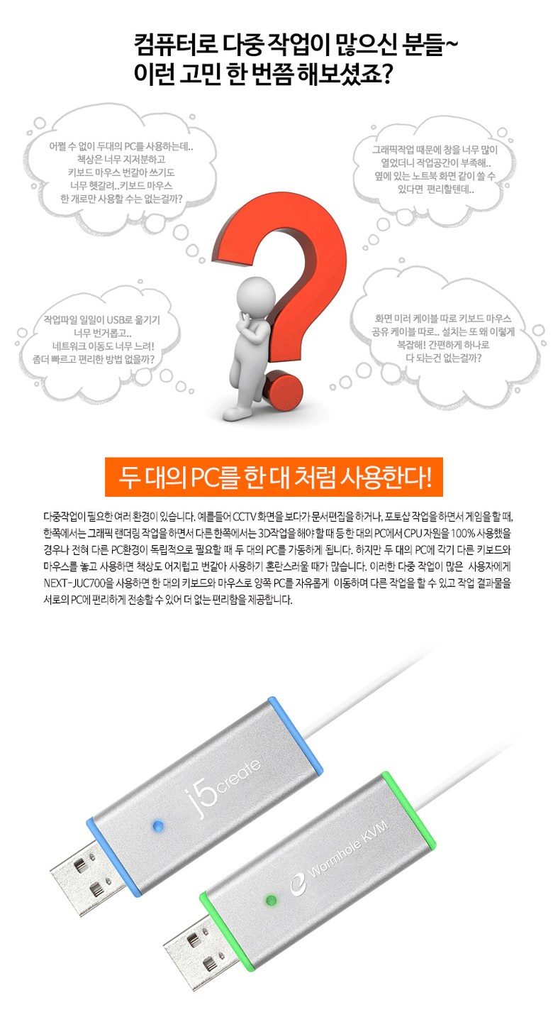 | 주요 사양 | 2개의 PC를 하나의 키보드 마우스로 제어하고 화면 공유및 파일전송까지 하는 KVM 스위치 |