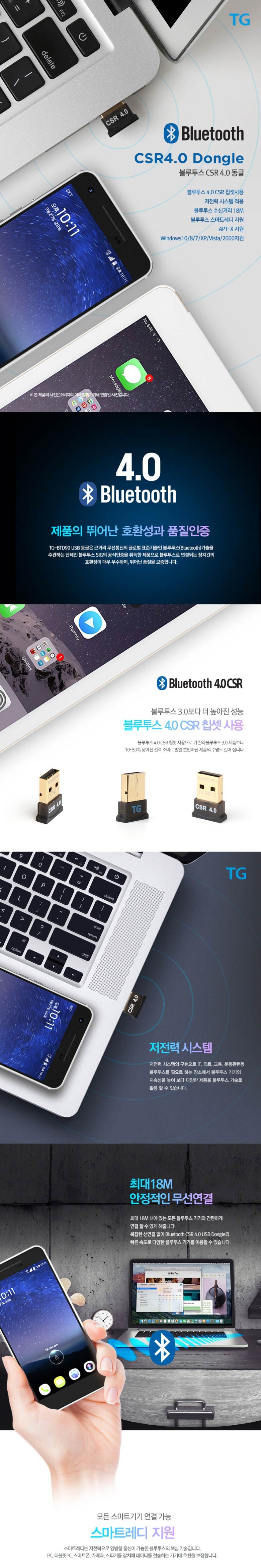 | 주요 사양 | USB 동글 / 일체형 / 4.0 ~ 4.2 / 2.4Ghz ~ 2.483Ghz / 최대 18미터 / 3Mbps / 14 x 23 x 5 mm / CSR Harmony / 스마트레디 지원 / 저전력 / Plug&Play 지원 |